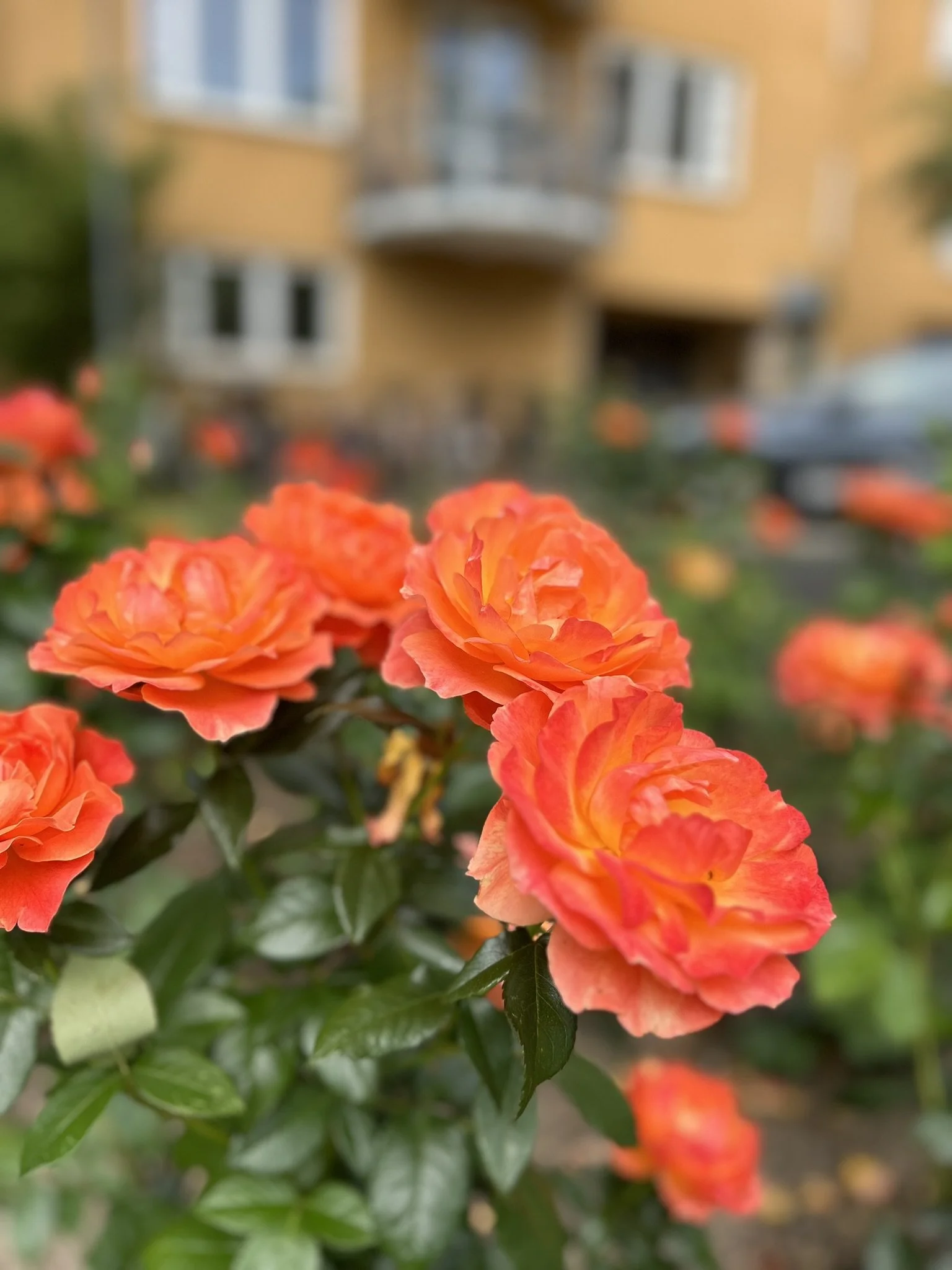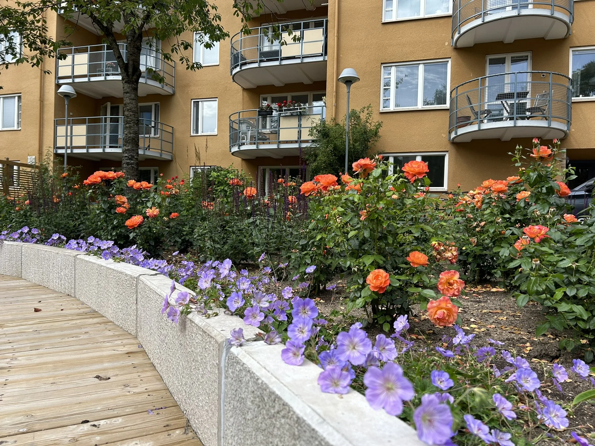 Växtligheten valdes utifrån långsiktigt hållbara sorter men med klara kontrastfärger för att möta den ockragula fasaden som dominerar miljön. Förvaltningsfrågan var också prioriterad i valet av perenner och träd.
